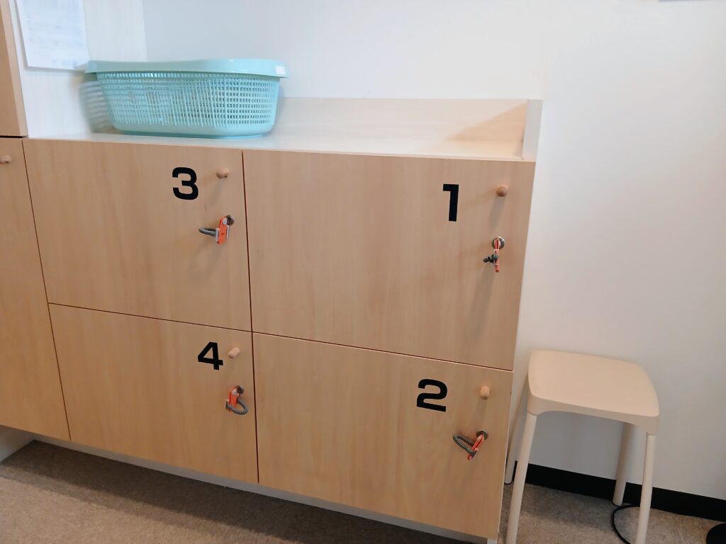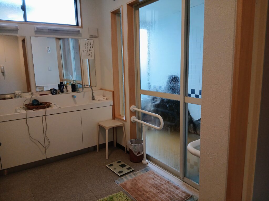 脱衣所はこんな感じ。化粧水や乳液が数種類ずつ用意されていました。手すりや緊急用ブザーも備え付けられていました。