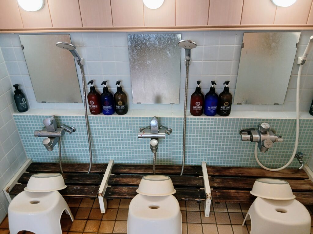 洗い場は3つ。左の2つはシャワーヘッドが大きく、水圧も強めで良かった。