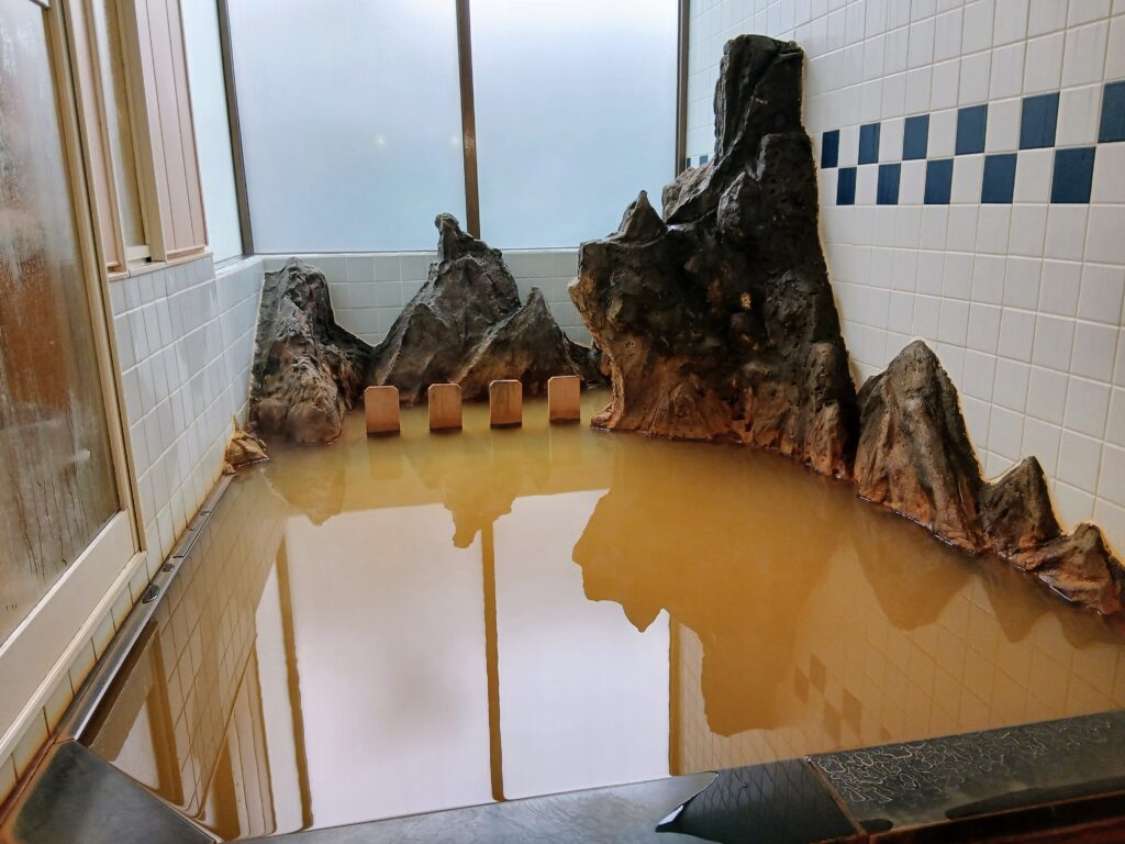 3人入れば満員くらいの小さめのお風呂。鉄分を含む赤茶色のお湯です。また、天然の保湿成分という「メタケイ酸」を多く含むそう。入ると包まれるようなやわらかいお湯でした。