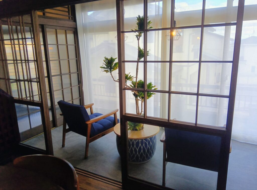 縁側だったところ?には、座り心地の良さそうな青のソファが。