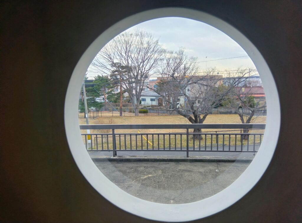 特徴的な丸い窓からは、目の前の公園の景色がよく見えます。