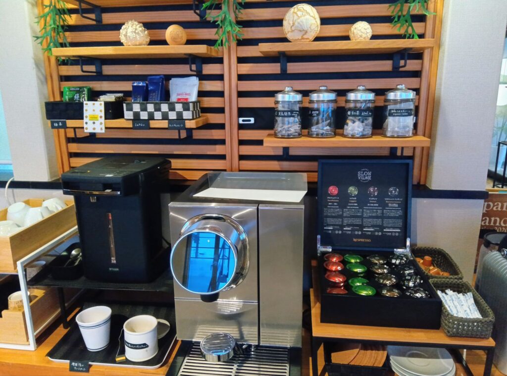 フリードリンクコーナー。いろんな種類のお茶やコーヒーが飲めます。ホットチョコレートやスパイスティーも。ネスプレッソがあって良かった。