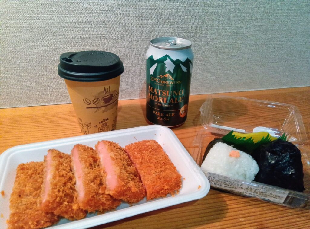 道の駅で買ったあれこれを栄養とかカロリーとか気にせず食べる。蔵王ビールにおにぎり、ハムカツ。