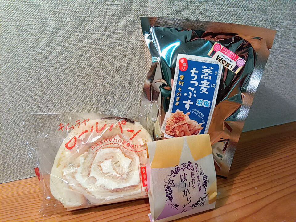 まだ食べる。蕎麦チップス少し、長井のはいからさん(ラムレーズンの入ったお饅頭)、キムラヤのロールパン。