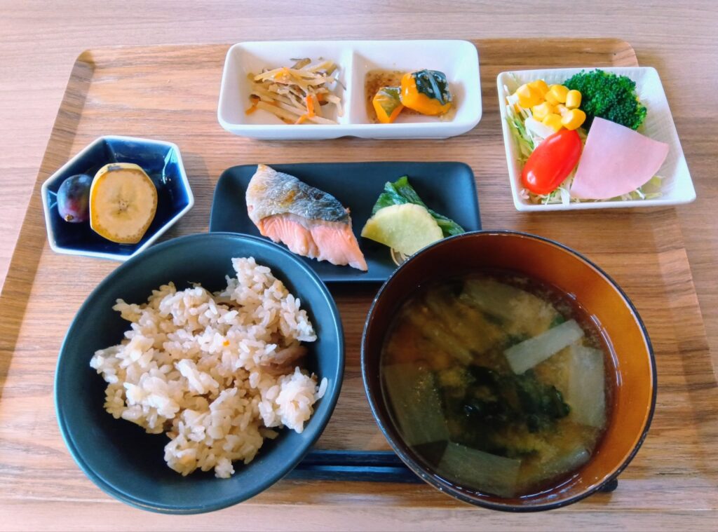 和定食。舞茸ご飯に、大根とわかめの味噌汁。あと、ご飯のお供いろいろ。高菜の漬物や甘めのきんぴらもあって、どれも美味しかったです。味噌汁にはかつお節が入っていたので、それが出汁かな。