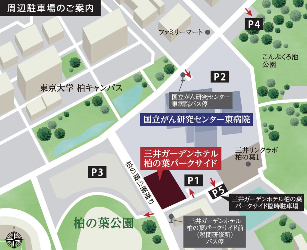 P3(柏の葉公園第一駐車場)は上限金額の設定がないため、P2(国立がん研究センター第一駐車場)に駐車しました。P2の場合、駐車券をフロントに提示すれば、24時間1,000円になります。