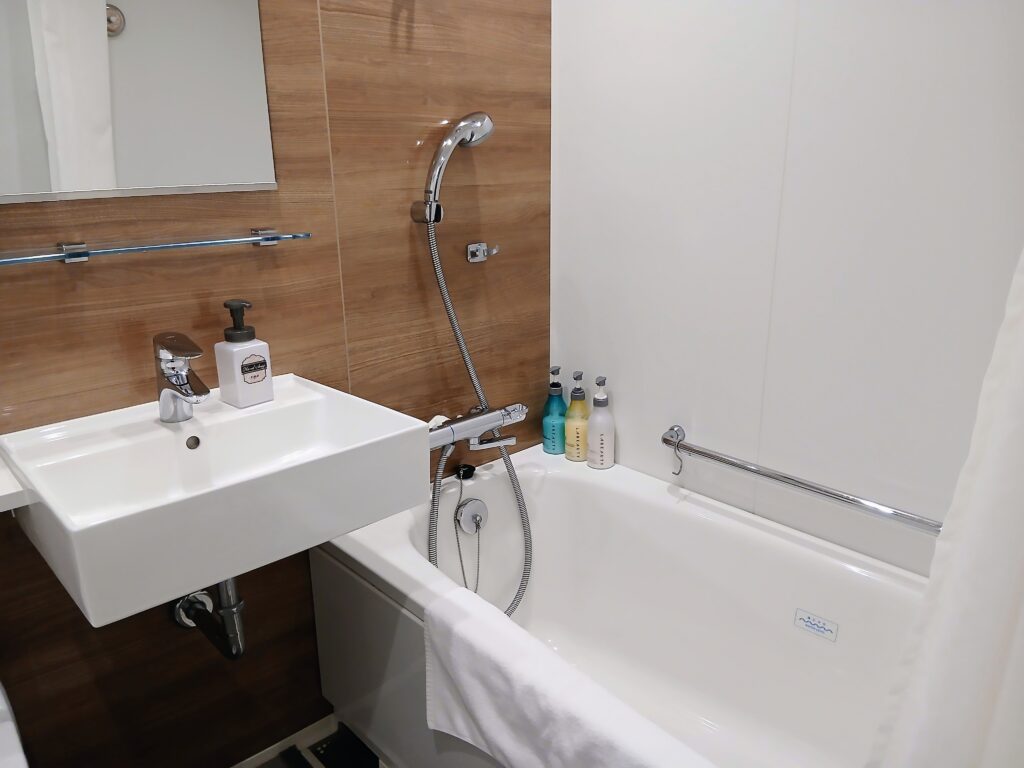 バストイレは同じ所にあります。バスタブは広め。カミソリ、歯磨きセット、シャワーキャップ、ボディタオル、くしがありました。ボディタオルはけっこう厚みがあって良かった。