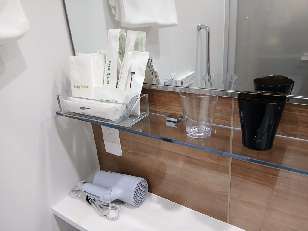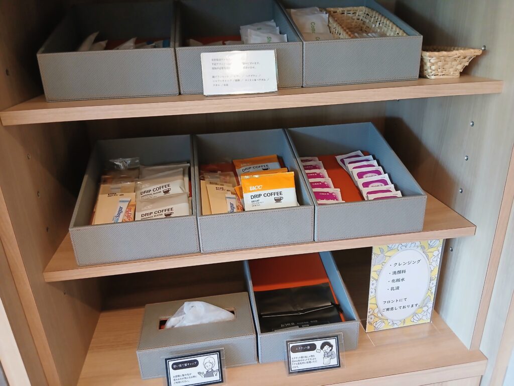 部屋に持って行けるドリップコーヒーやティーバッグもありました。クレンジング、洗顔料、化粧水、乳液はフロントに言えばもらえるようです。