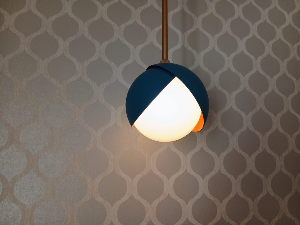 クッションのオレンジや、ライトの笠のブルーグレーがアクセントになっています。この壁紙もかわいい。