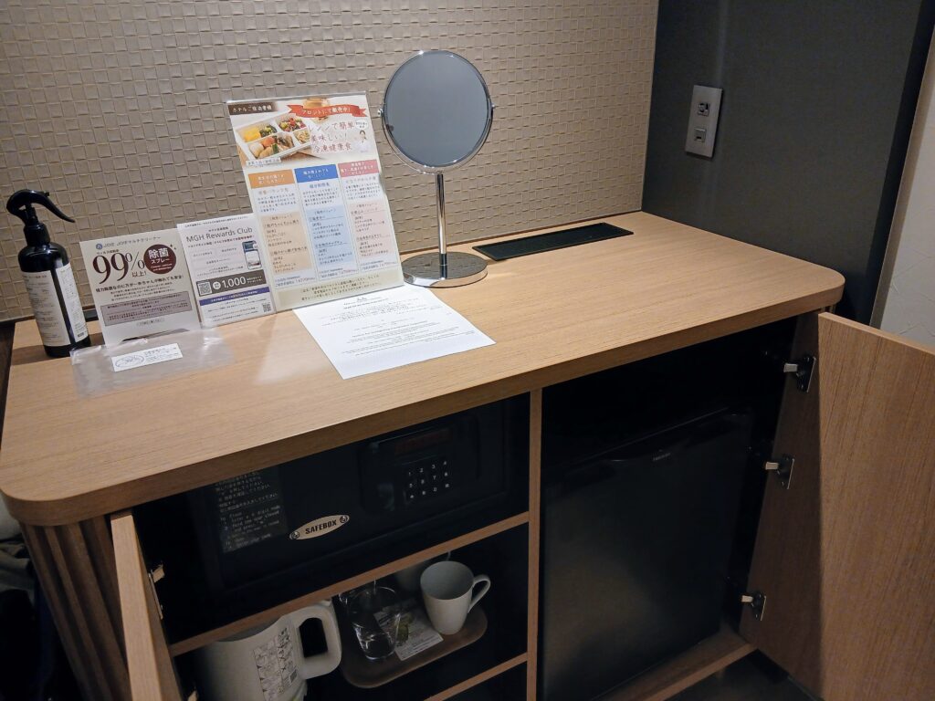 部屋着はスーツケースを置く台の下の棚に入っていました。上下が分かれているタイプ。