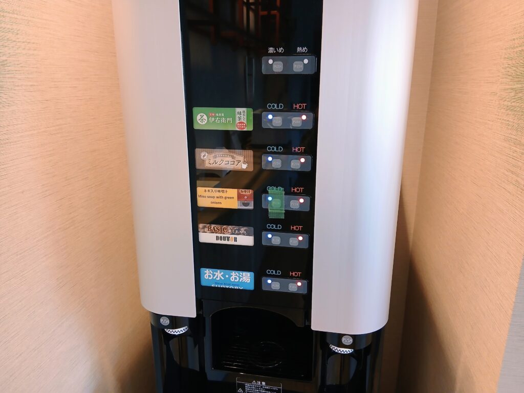 緑茶、ミルクココア、ネギ入り味噌汁、コーヒー、お水・お湯を飲めます。
