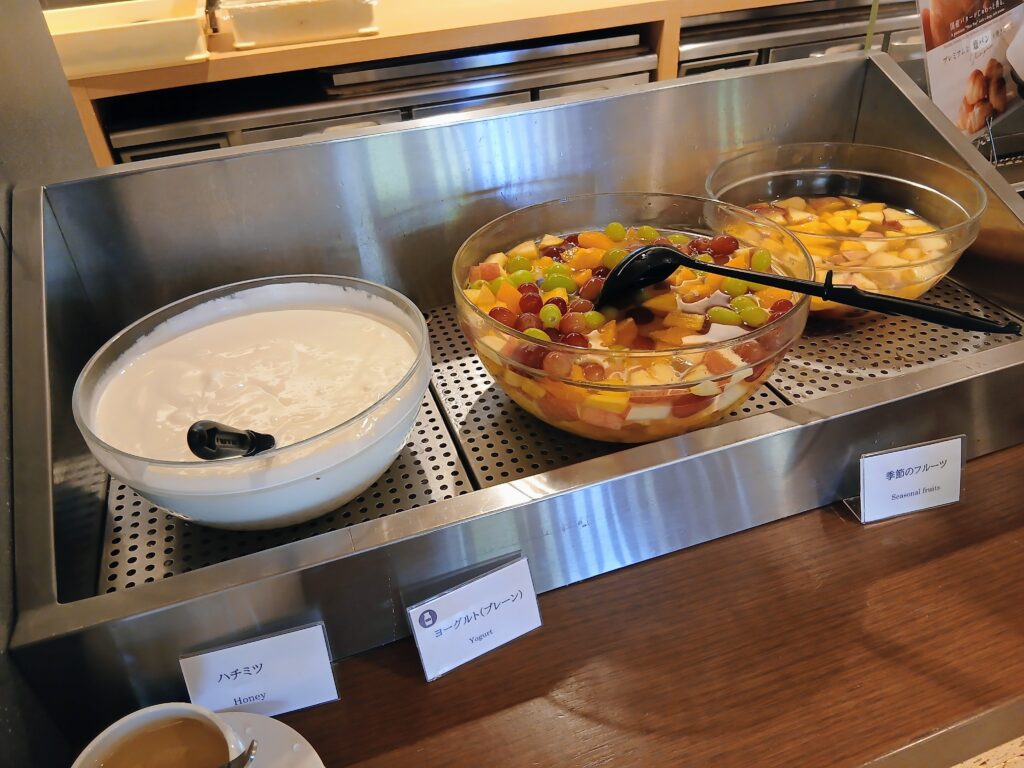 ヨーグルトに、季節のフルーツ。ぶどうが入っていたのが嬉しかった。