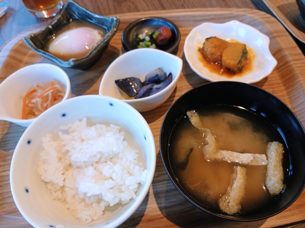 温泉卵、切り干し大根、漬物、かぼちゃの煮物などの小鉢に、