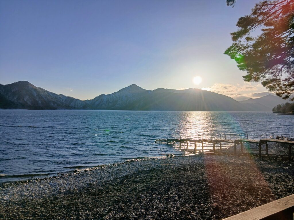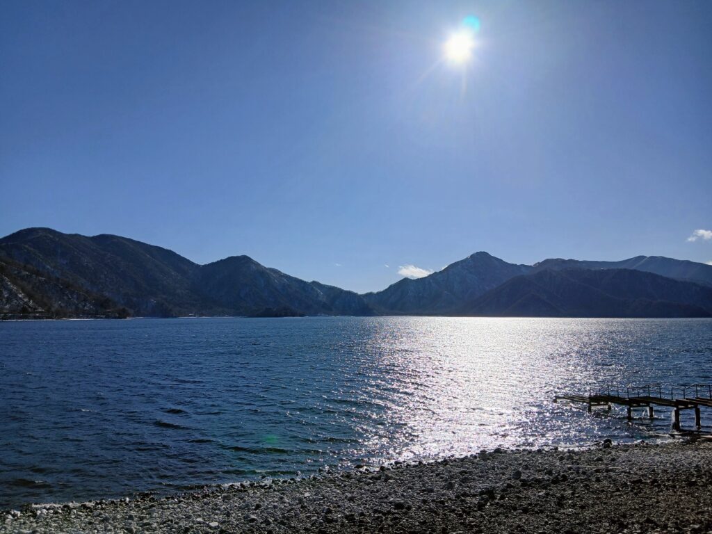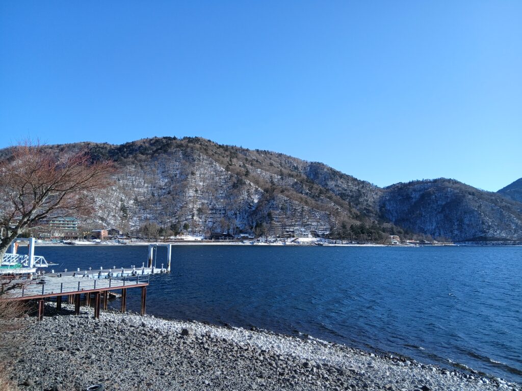 左側を見るとこんな感じ。中禅寺のある方向。近くに遊覧船乗り場がありますが、12月から4月中旬まで冬季休業のため、行き交う船の姿はなし。