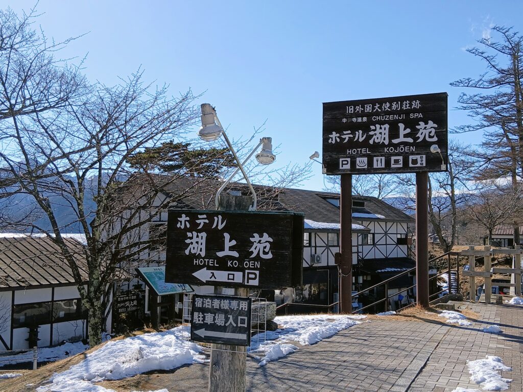 日光市街から中禅寺湖に向かうくねくねした山道(いろは坂)を登りきり、中禅寺湖に沿って車を走らせると、湖上苑の看板が見えてきます。