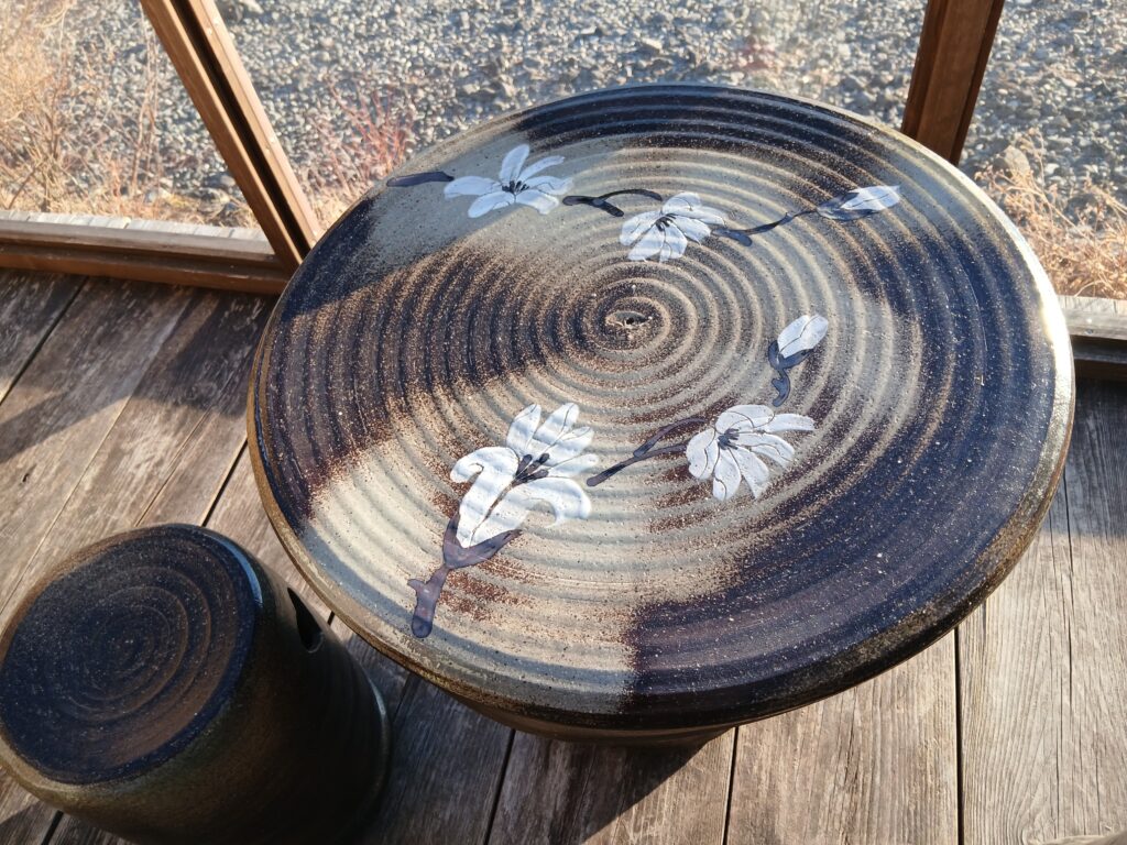 部屋の中から見る景色も良いですが、やはり窓を隔てずに見たいと思い、何度もベランダへ。寒いけど。陶器のテーブルに描かれた花がかわいい。
