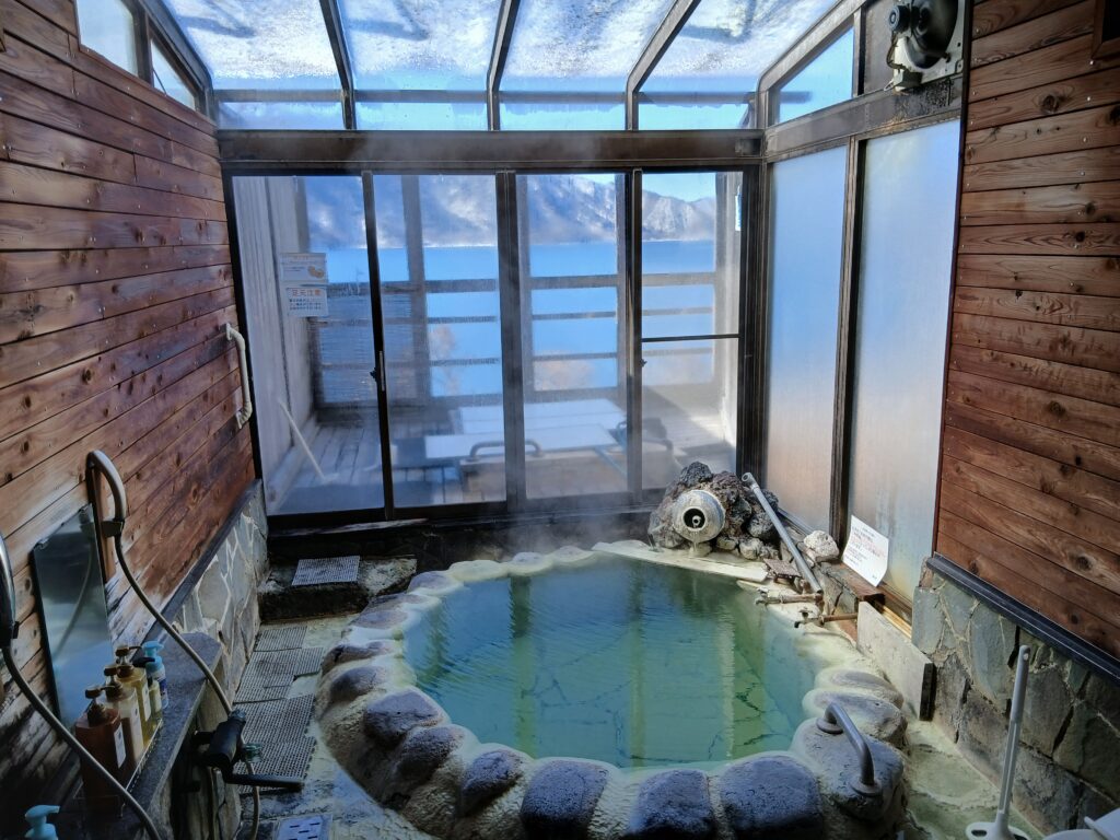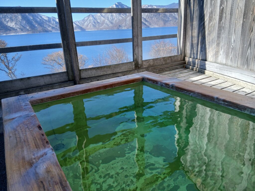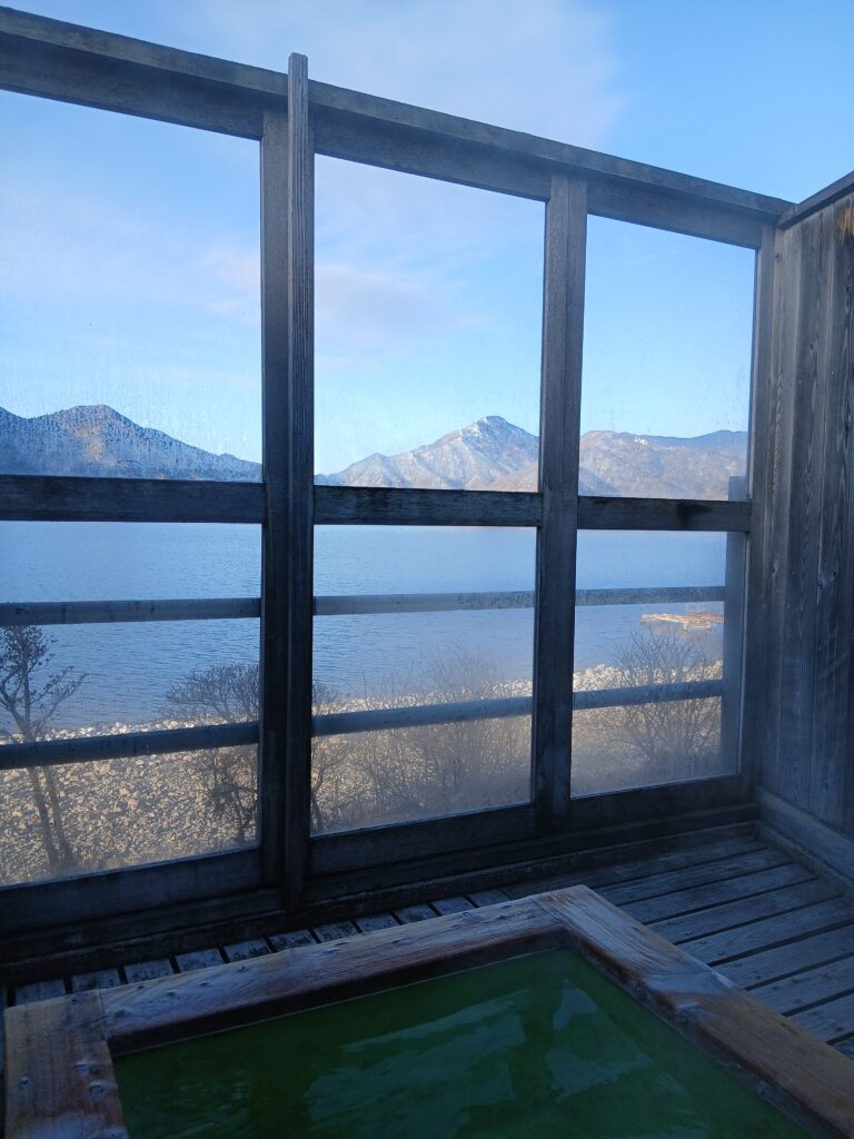 1人か2人で入るお風呂。洗い場は1つ。ここの窓からもしっかり中禅寺湖が見えます。