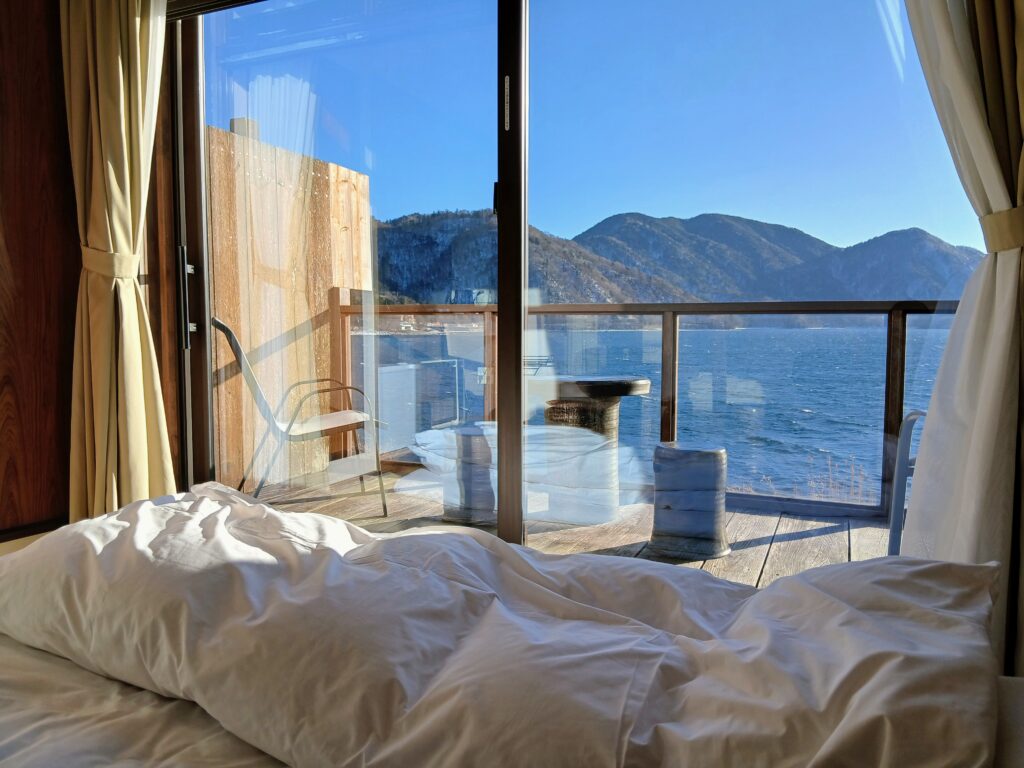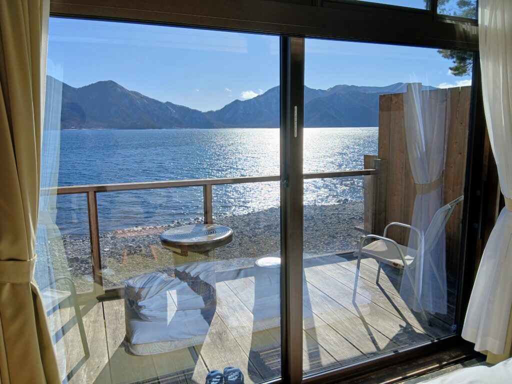 すぐ目の前に中禅寺湖が広がります!窓を開けてベランダに出てみると…