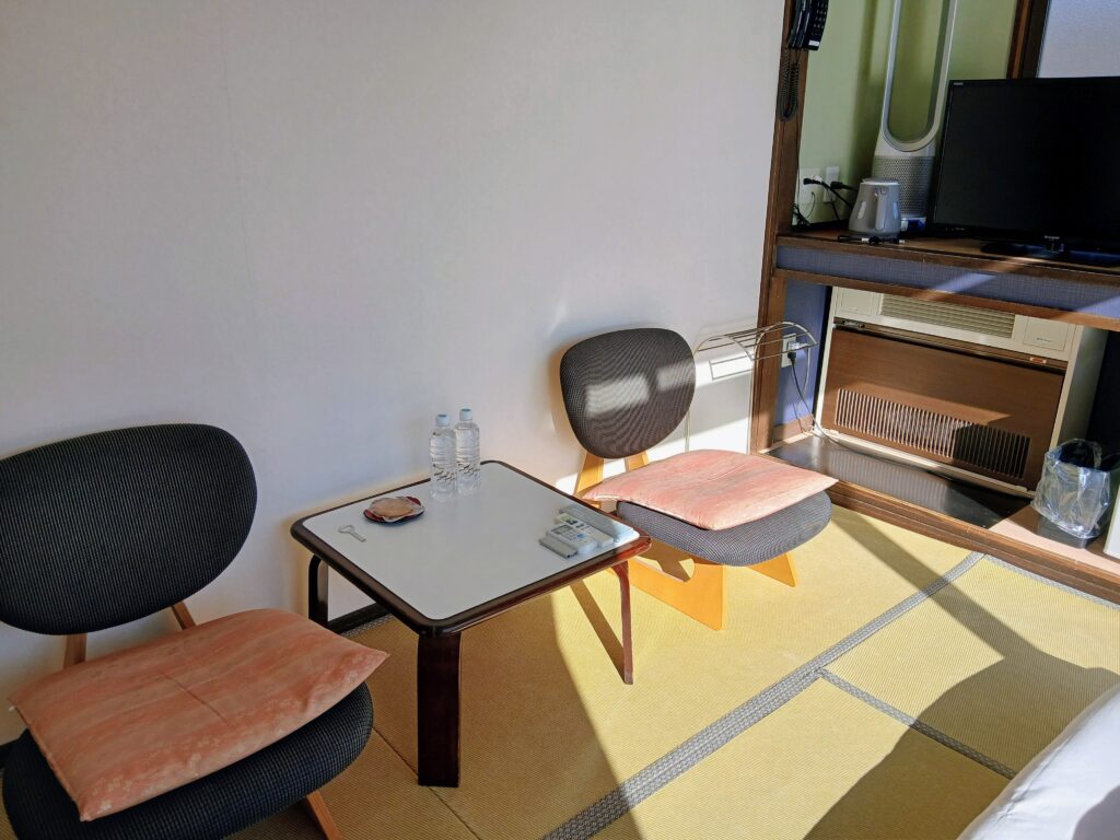 椅子は窓に向けて置かれていました。ここに座って見ても素晴らしい景色。水のペットボトルが2本と醤油せんべいが用意されていました。
