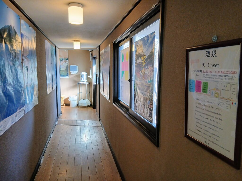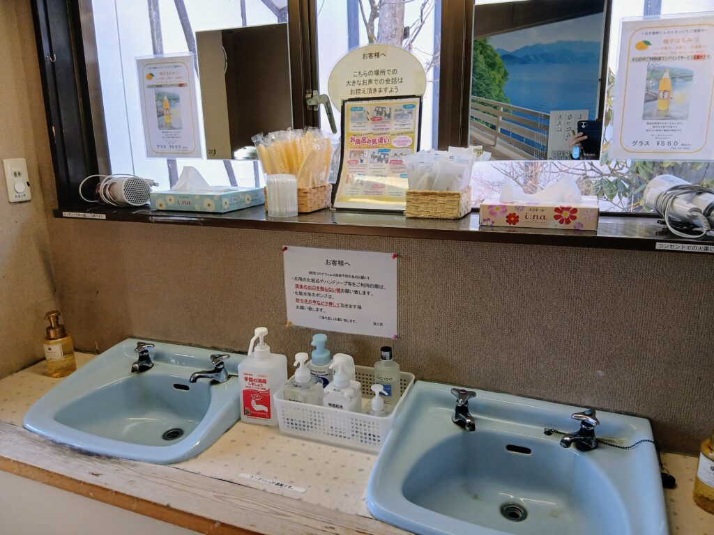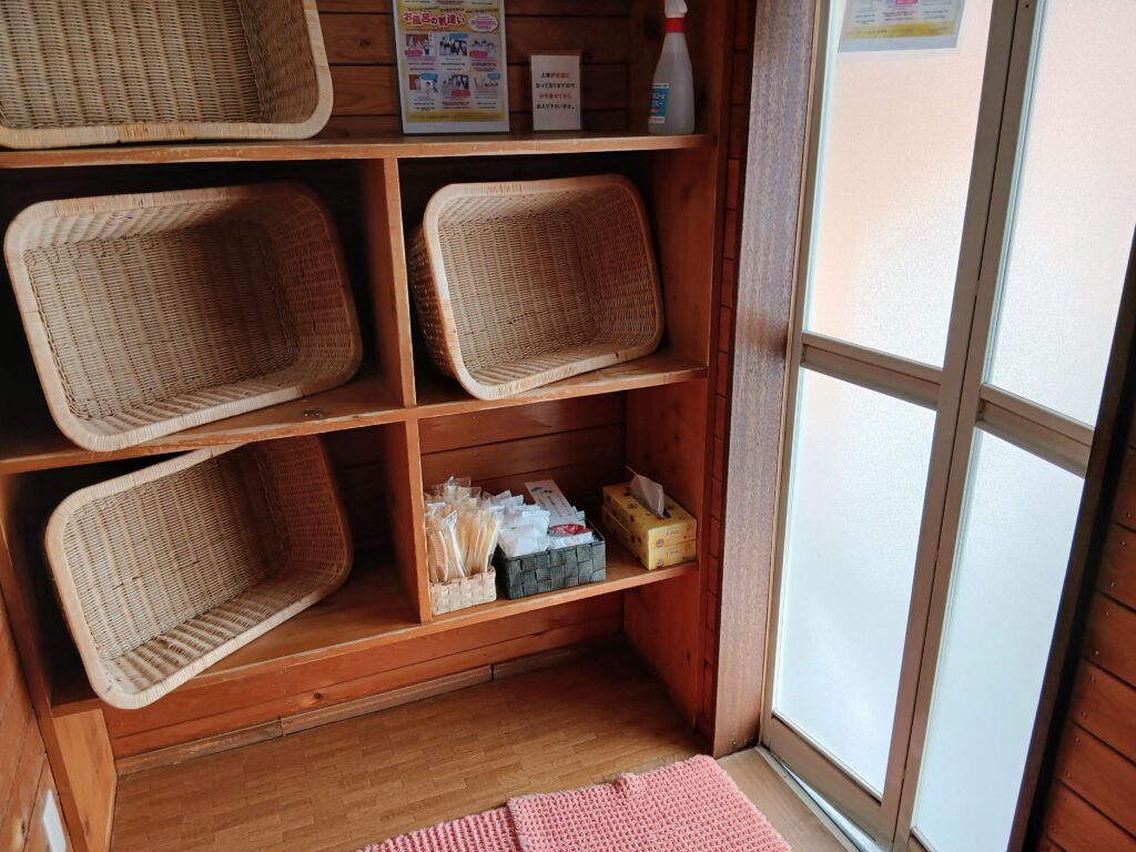 お風呂から部屋に戻る途中に洗面台があり、化粧水や乳液が用意されていました。後ろには風呂上がりに嬉しい冷水器もありました。ちなみにトイレは、1階の少し離れた所にありました。