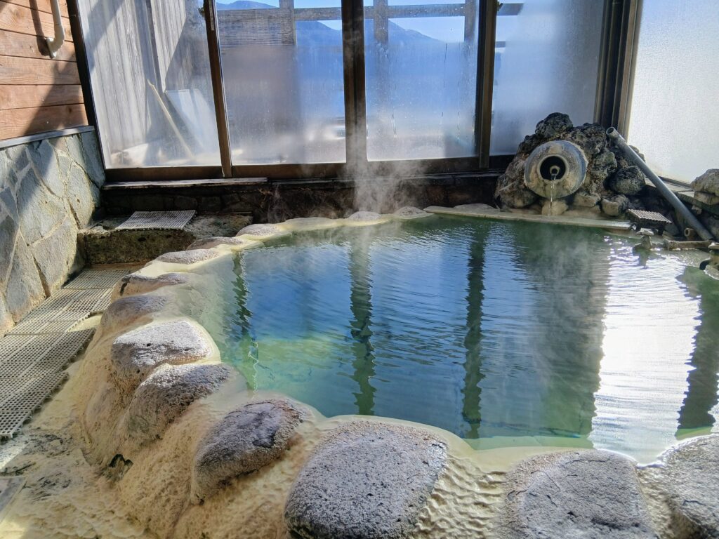 内湯は3人くらいで入るとちょうど良い広さ。硫黄のにおいがします。そして…