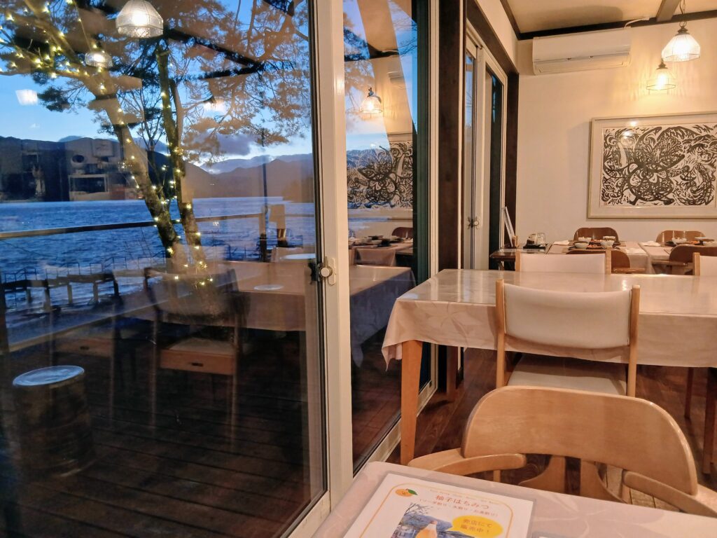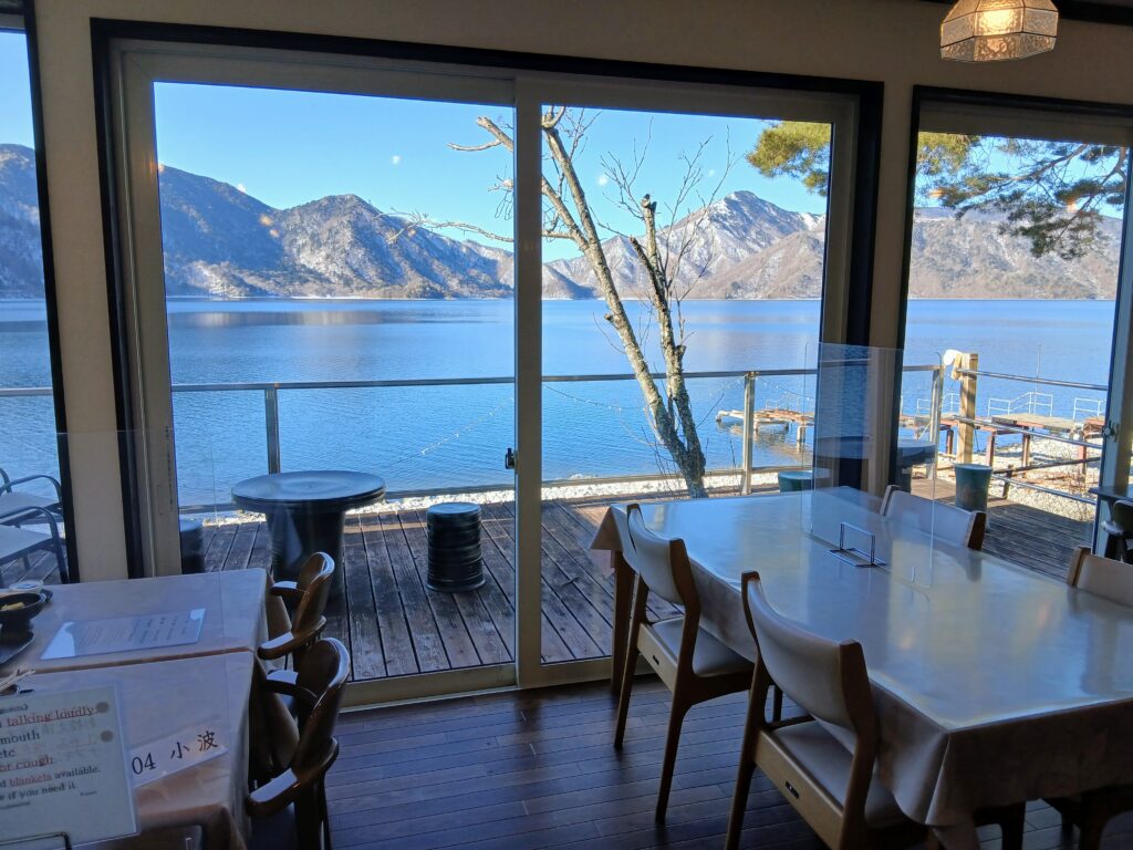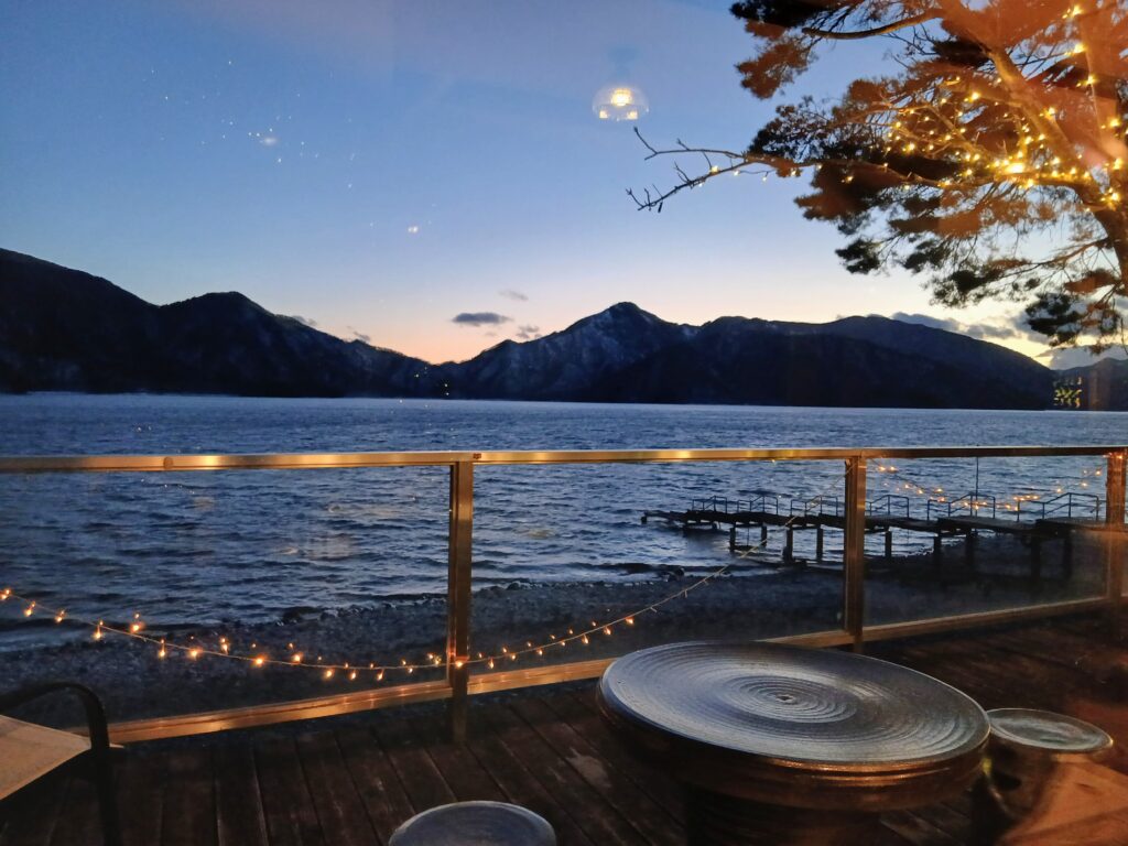 レストランの窓からもきれいな中禅寺湖ビュー。だいぶ暗くなってきました。