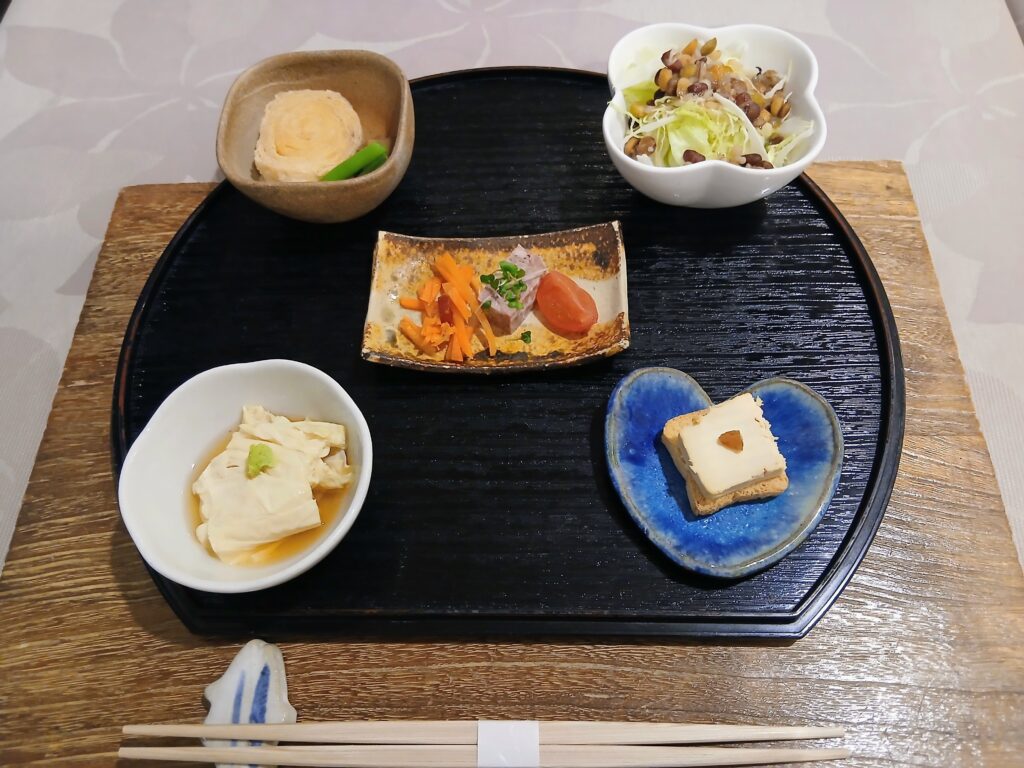 前菜5種。左上から、揚げ巻きゆば、五穀豆と五穀のサラダ、豚肉と鶏レバーのパテ、生ゆば、クリームチーズのたまり漬け。