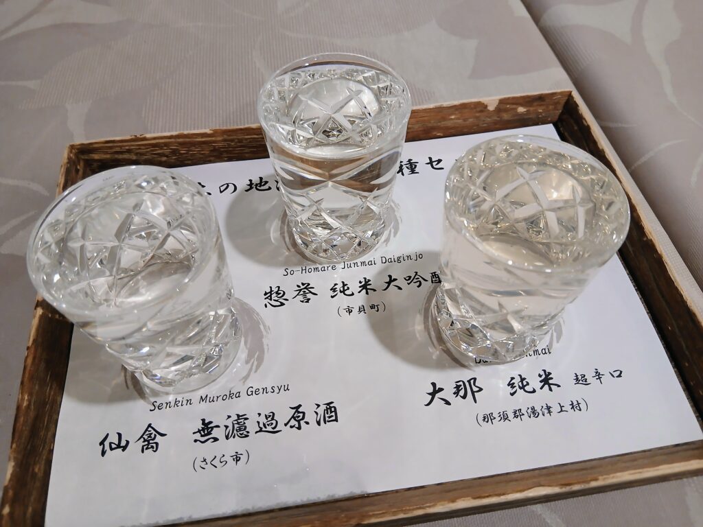 仙禽 無濾過原酒(さくら市)、惣誉 純米大吟醸(市貝町)、大那 純米超辛口(那須郡湯津上村)が出てきました。