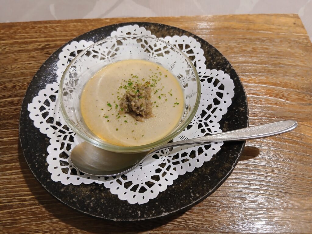 豆乳ときのこの茶碗蒸し。ガラスの器に入ってお洒落。上にのったきのこのペーストと一緒に食べると美味しい。