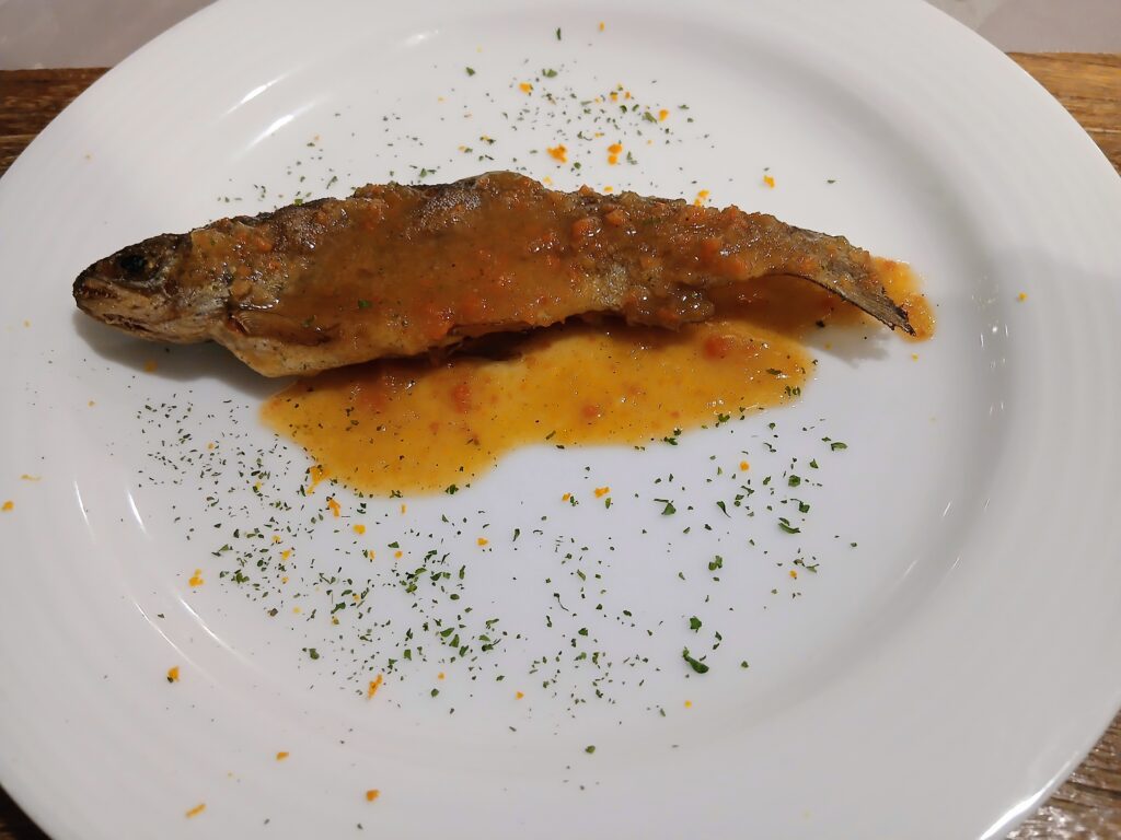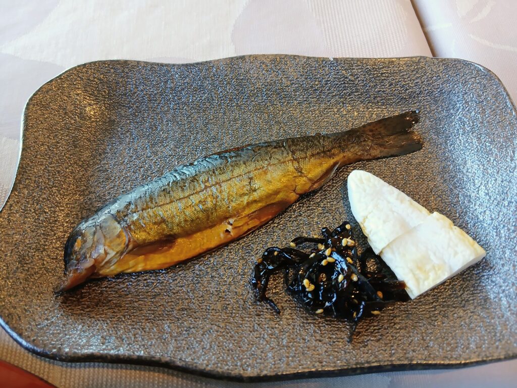 ニジマスの甘露煮。これも頭からしっぽまで食べられます。甘辛くて美味しかった。