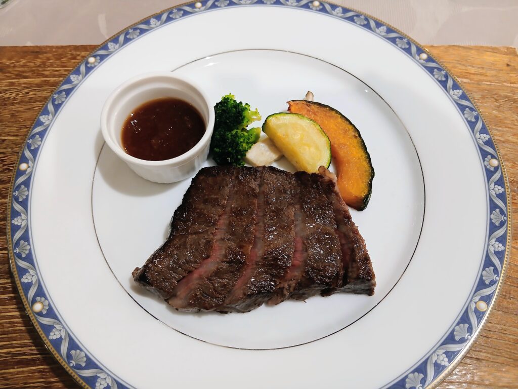 国産牛のサーロインステーキ。オニオンソースにつけて、さっぱりといただきます。焼き加減が絶妙で、お肉がすごくやわらかかった。