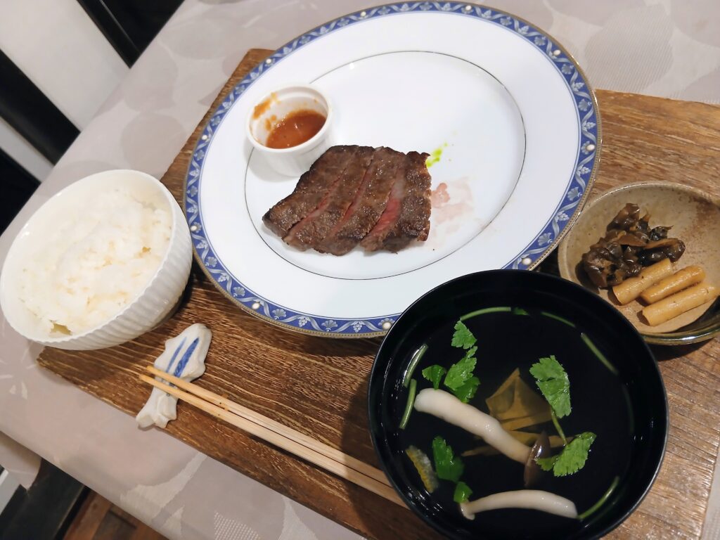 お肉を食べている途中にご飯が欲しくなり、お願いしました(ステーキの食べかけがお目汚しですみません)。ご飯、お吸い物、漬物は好きなタイミングで持ってきてもらえます。お肉とご飯のループ…幸せ。
