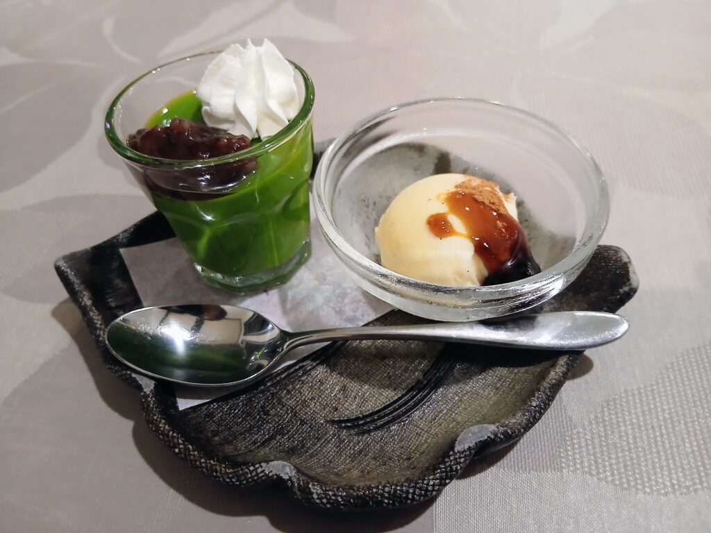 デザートは抹茶のプリンと黒糖をかけたバニラアイスクリーム。抹茶の苦味がしっかり感じられて美味しかった。黒糖がけのアイスも美味。