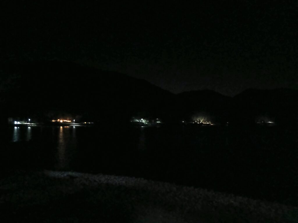 寝る前に部屋のベランダから撮った夜景。左側(中禅寺方面)だけ明かりがあり、右側は真っ暗でした。