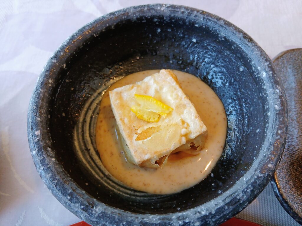 揚げ豆腐にごまだれをかけたもの。外がカリカリ。