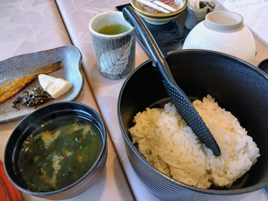 おひつに入ったご飯に、わかめと豆腐のお味噌汁。ご飯も美味しいし、おともも多いしでいつもよりたくさんいただきました。