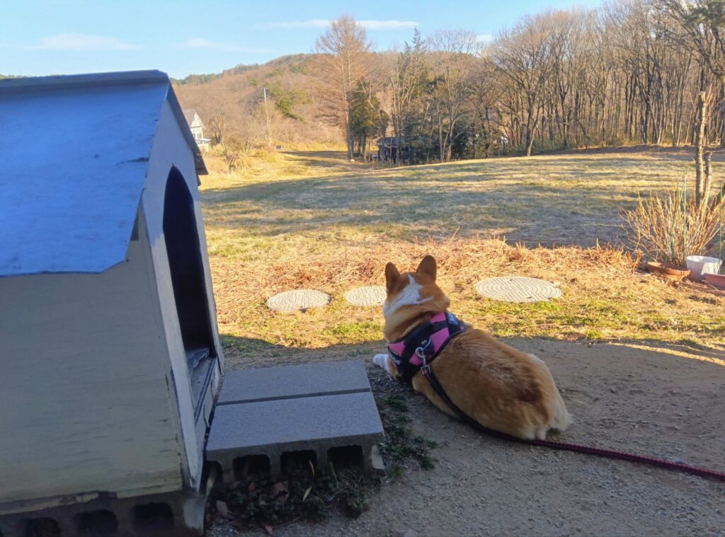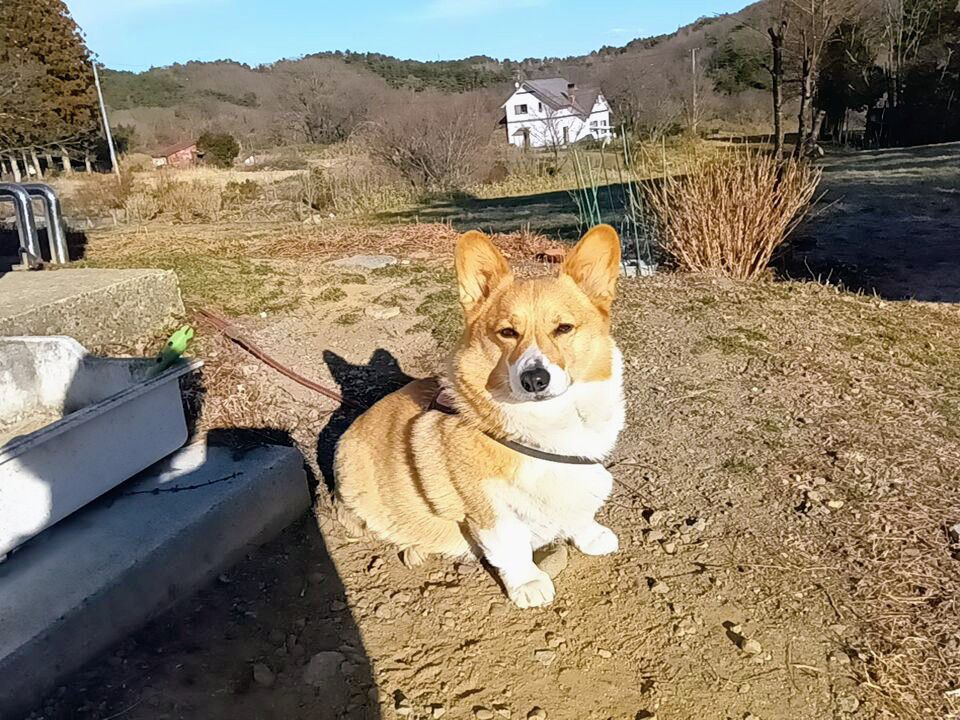 そばには看板犬?のコーギーがいました。見知らぬ客にけげんな表情?