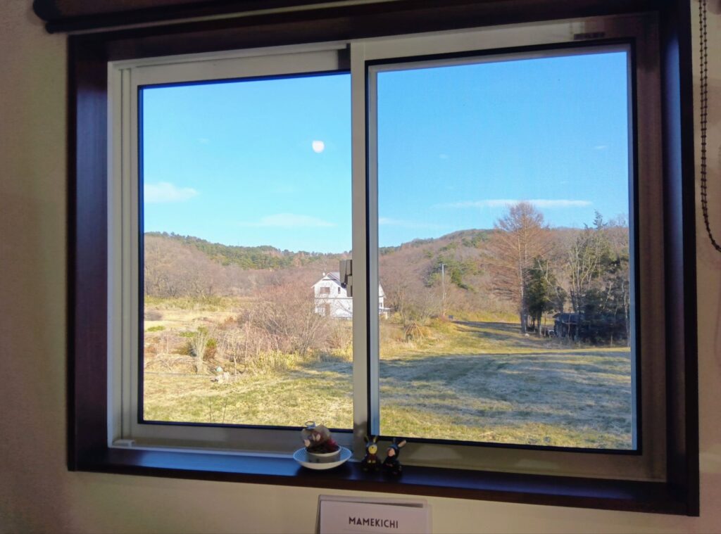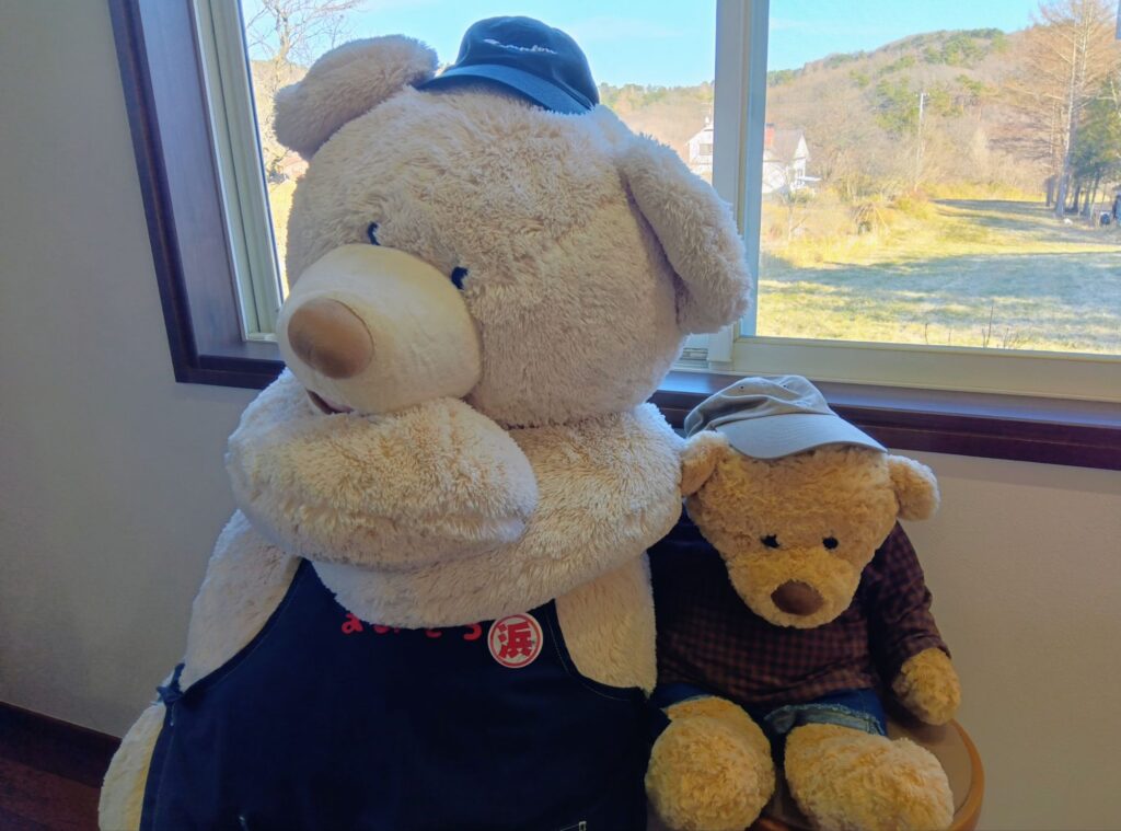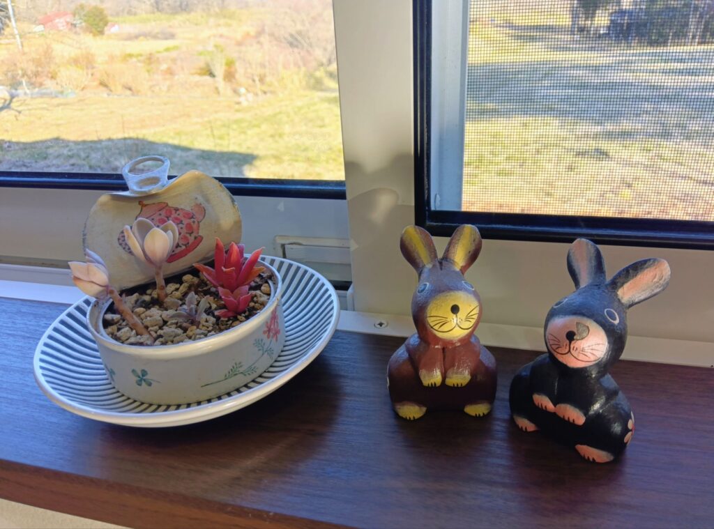 窓辺に置かれた大きなぬいぐるみや、うさぎの置物。どれも可愛い。