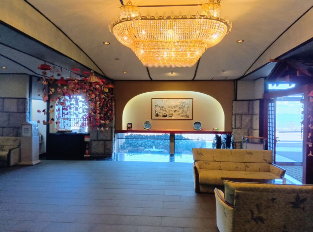 シャンデリアのある広々としたロビー。