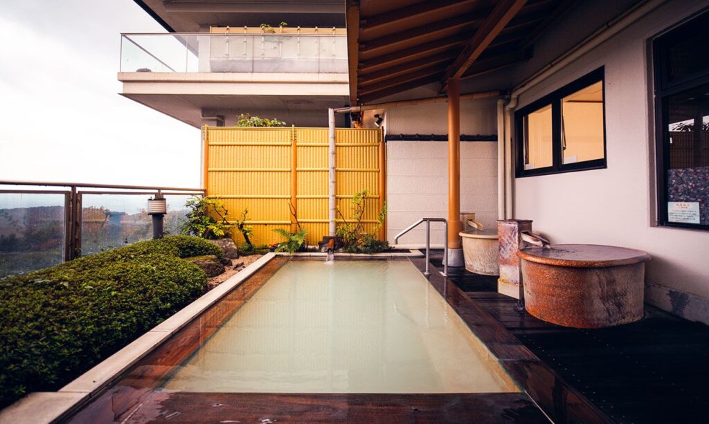 露天風呂(公式HPの写真をお借りしました)。陶器風呂が2つ。