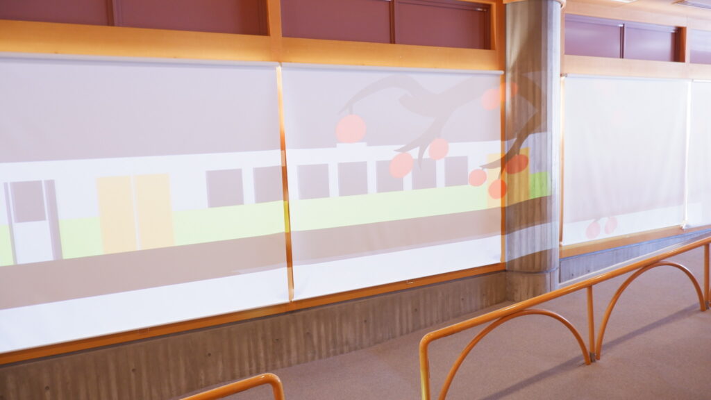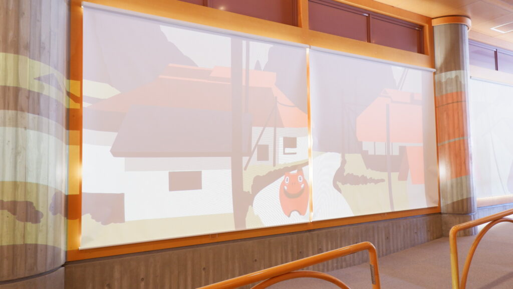 展示室に向かう通路の壁に、「柳津めぐり」というアニメーション作品が映し出されていました。筑波大学と斎藤清美術館のコラボで制作されたそう。柳津町に関する4種類の風景を楽しめました。