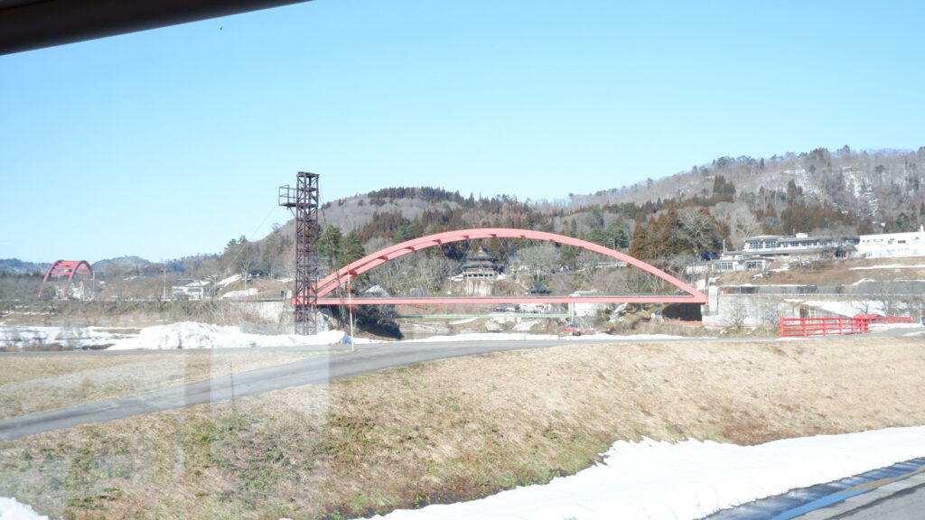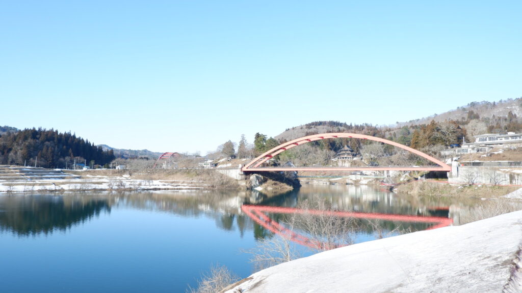 美術館を後にし、すぐ裏で撮った只見川の写真。山や橋が川に映りきれいでした。