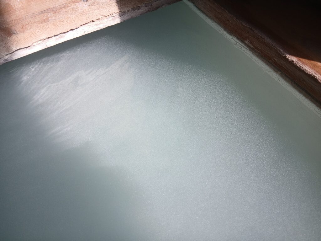 光の当たり具合で青っぽく見えたり、白っぽく見えたりします。細かな湯の花も見えます。腕を上げると全体的につくほどで、濃いお湯。