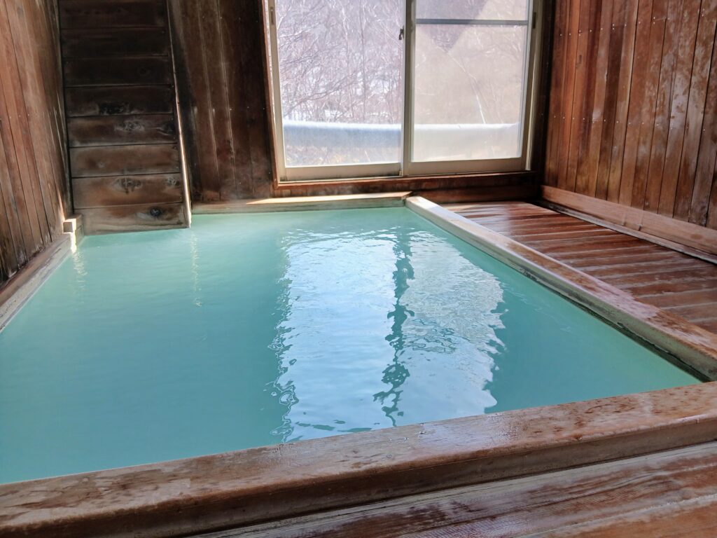 高湯温泉は強めの酸性で、ミルキーブルーの硫黄泉です。車の窓を閉めきって運転していても、温泉に近づくと車内で硫黄のにおいがしてきました。