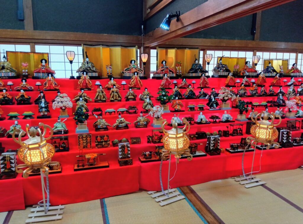 広間にはおひなさまがたくさん並んでいました。7段飾りで迫力があります。明治、大正、昭和のものがあり、それぞれ表情が少しずつ違っていました。