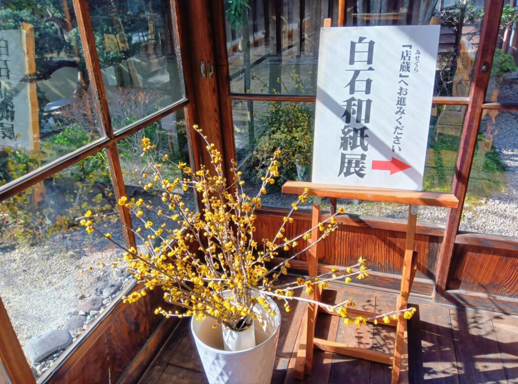 縁側の奥には、白石和紙展の案内が。店蔵で展示されているとのこと。