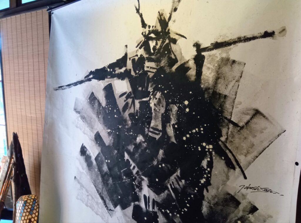 店蔵に向かう廊下の壁にあった、馬を走らせて戦う勇ましい武将の姿。モノトーンだとさらに強そう。