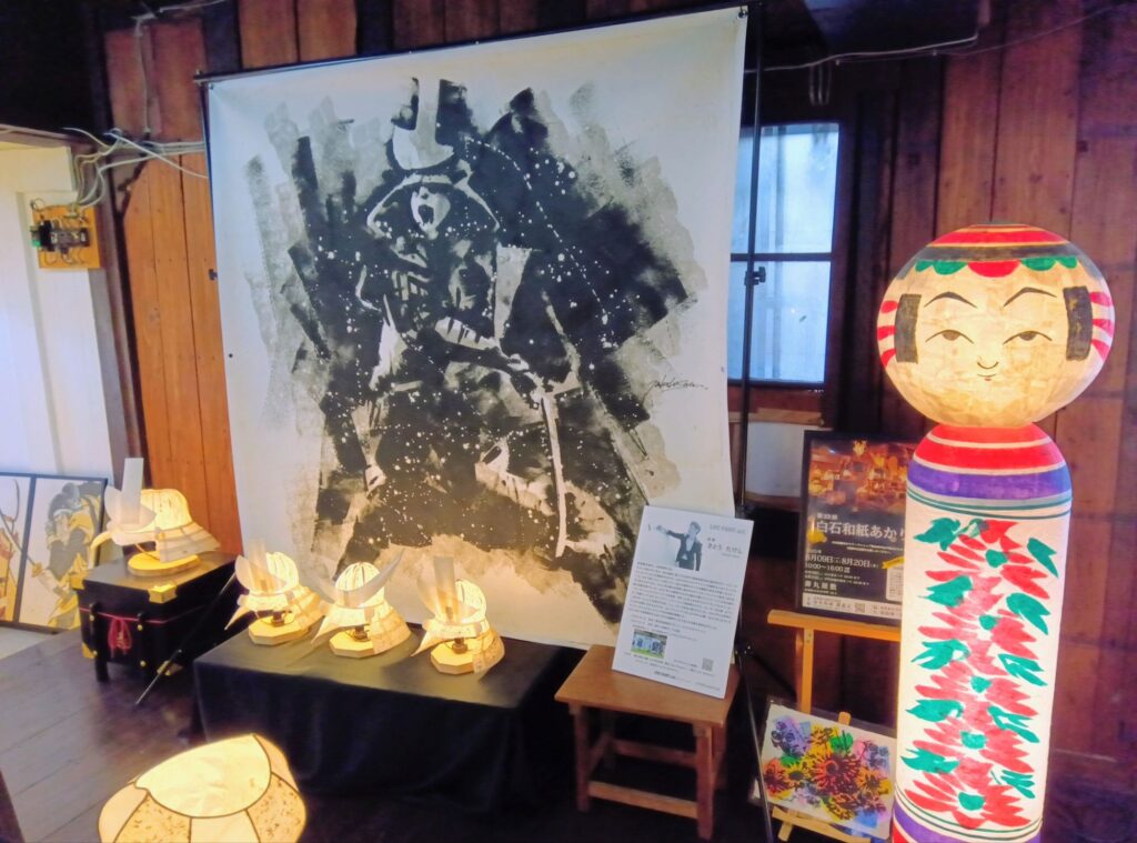 店蔵に入ると、また違った絵柄の武将や、こけし、兜が展示されていました。和紙でできた兜もかっこいいな。