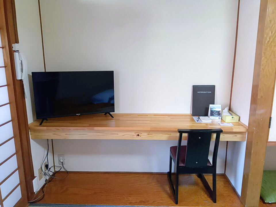 反対側にはテレビと広めのデスク。縁側に洗面台と冷蔵庫がありました。