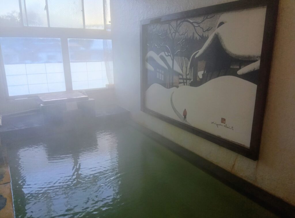 内風呂はこんな感じ。洗い場は2つです。斎藤清画伯の会津の絵がありました。チェックインする前に美術館に行ってきたので、ここにもあって嬉しい。